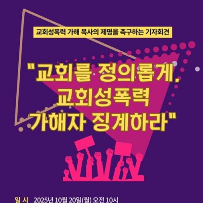 교회성폭력 가해 목사의 제명을 촉구하는 기자회견 연대 요청 교회를 정의롭게 교회성폭력 가해자 징계하라 교회 목사에 의한 성폭력 사건에 대해 대법원이 5년형의 유죄를 인정하였지만, 가해자가 소속되어 있는 대한예수교장로회합동총회 전북남노회에서는 가해목사에 대한 징계를 하지 않고 있습니다. 이에 가해목사의 제명을 요구하고, 교회의 책임있는 대책 마련을 요구하는 기자회견을 진행하오니 많은 관심과 참여를 부탁드립니다. 기자회견 일시 : 2025.10.20.(월) 오전 10시장소…